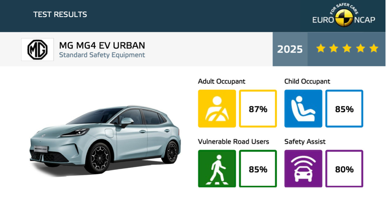 硬核的安全实力,需要权威测试的验证。国家级权威评测机构中汽中心对全新MG4半固态电池系统开展了远超国标及行业最高标准的严苛测试,测试标准整体加码超过20%。在螺纹钢穿刺、电芯三向极限挤压、高盐腐蚀液浸泡、极寒冰冻、底部球击以及高温火烧等六大极端工况挑战中,该电池系统均表现出色,全部顺利通过测试,用实打实的测试数据证明了其“真安全”的硬核实力。值得一提的是,整车安全同样斩获国际认可,在最新一期Euro NCAP欧洲新车碰撞测试中,全新MG4成功荣膺五星安全评级,在成人乘员保护、儿童乘员保护、弱势道路使用者保护及安全辅助系统四大核心测试项目中均取得高分,全方位筑牢出行安全防线。